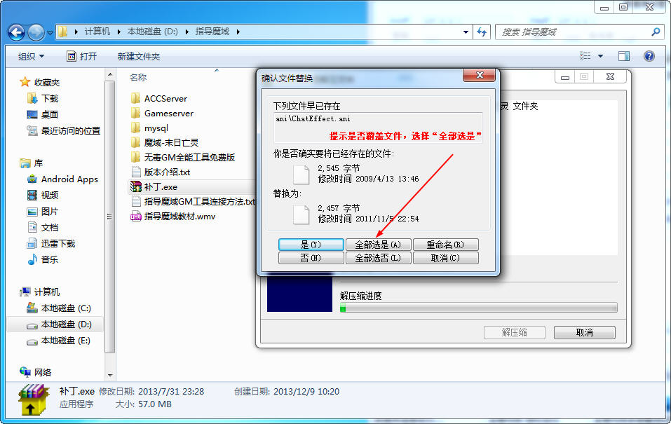 安装补丁时会提示覆盖游戏文件,全部选是即可。