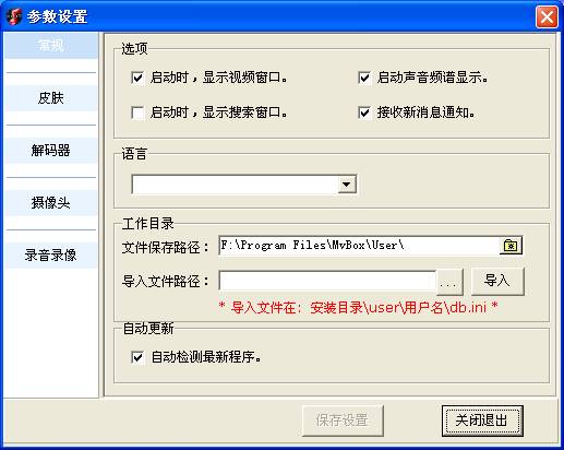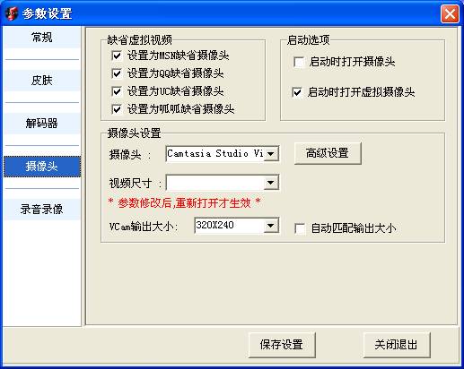 参数设置包括:常规、皮肤、解码器、摄像头、录音录像