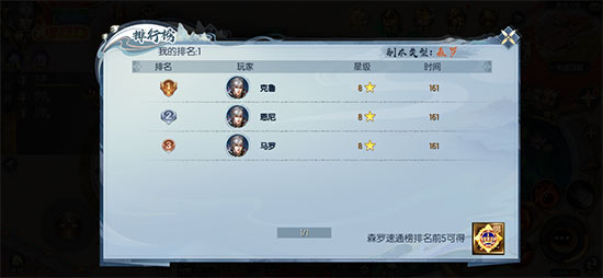 各分榜将记录本服通关情况并进行排名,排名依据通关星级、通关耗时、角色创建时间进行排序:通关星级越高,排名越靠前;若通关星级一致,通关耗时越短,排名越靠前;若通关耗时相同,则角色创建时间点越早,排名越靠前。