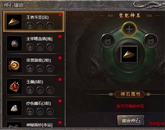可镶嵌的部位为盾牌,面纱,勋章,玉佩,疗伤石,斗笠共6个部位,每个部位可解锁3个孔位,即有18个孔位可以解锁镶嵌神石,每个部位的孔位都解锁需要90000传奇币。需要注意的是,同类型神石最多生效三个,即最多镶嵌三个同类型神石,超过三个其余无效。
