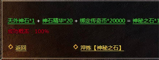 可用1个天外神石+20个神石精华+20000个传奇币淬炼成神秘之石
