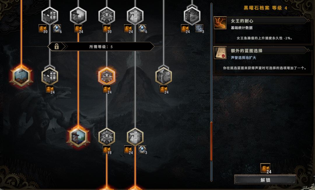 《风暴之城》在一局游戏结束时都可以获得食物储备,这个奖励是用来解锁升级各种 “能力” 的,比如降低女王急躁值上升速度。