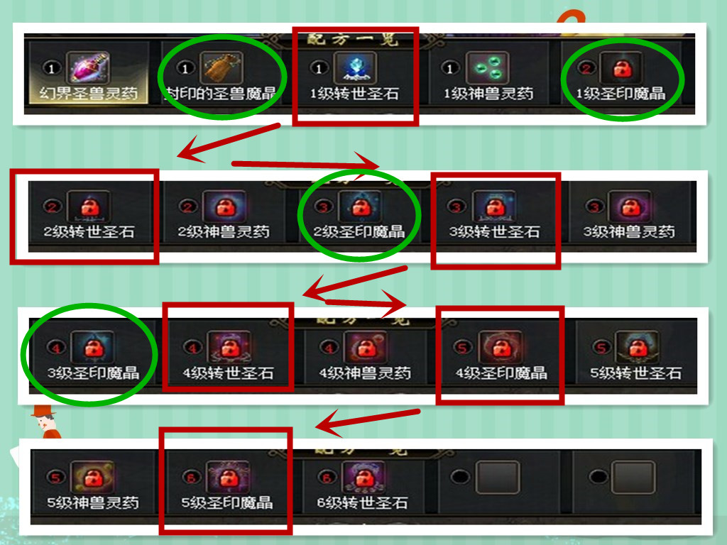 这就是我走过的兽灵师满级之路的指导图,从兽灵师1级的产品转世圣石到4级的产品4级转世圣石,都是亏本的,这个本指的是自己的劳力——刷材料,但亏损程度也不是那么大,一般我都是把其更换为材料,哪怕是少些,我也认了。又有人质疑了,那些东西谁要啊,你不要不代表别人不要啊。