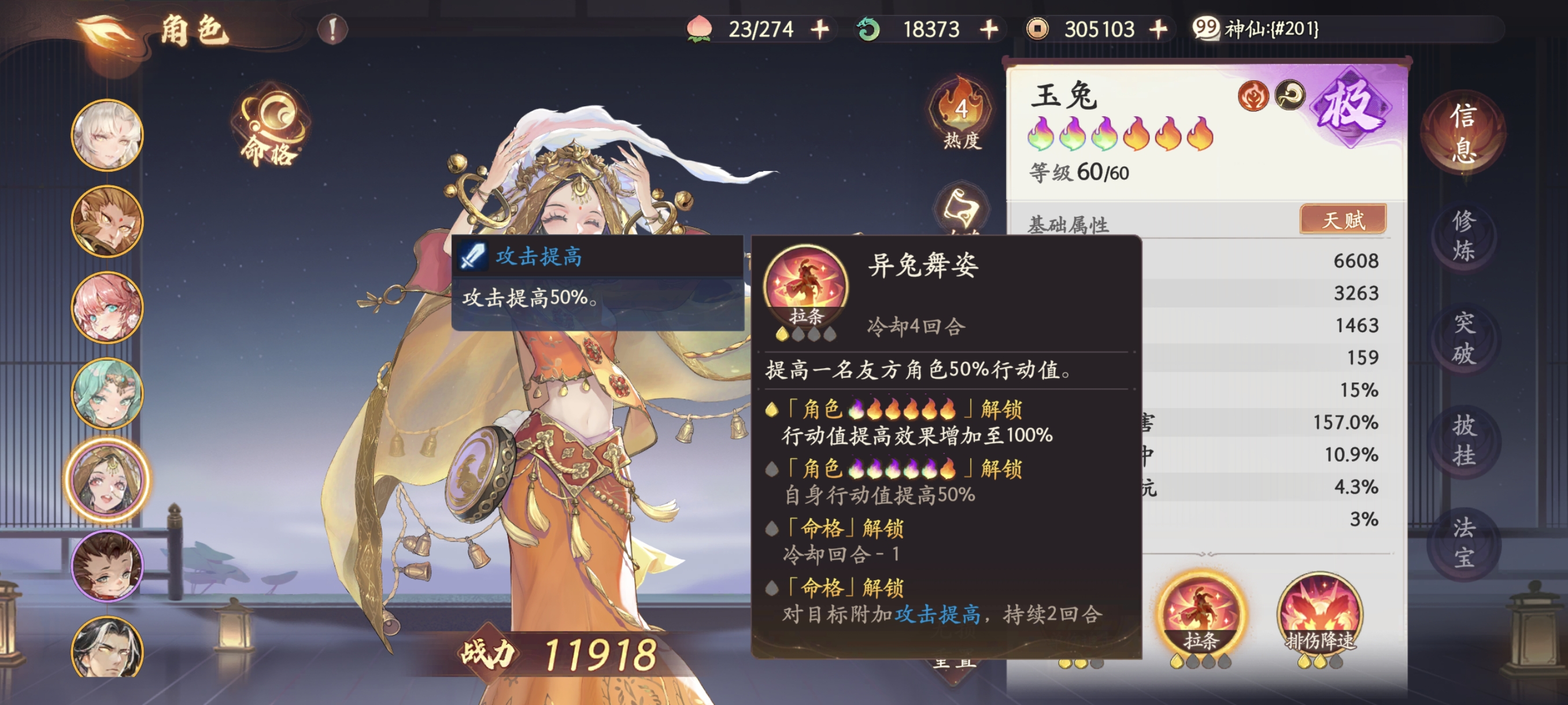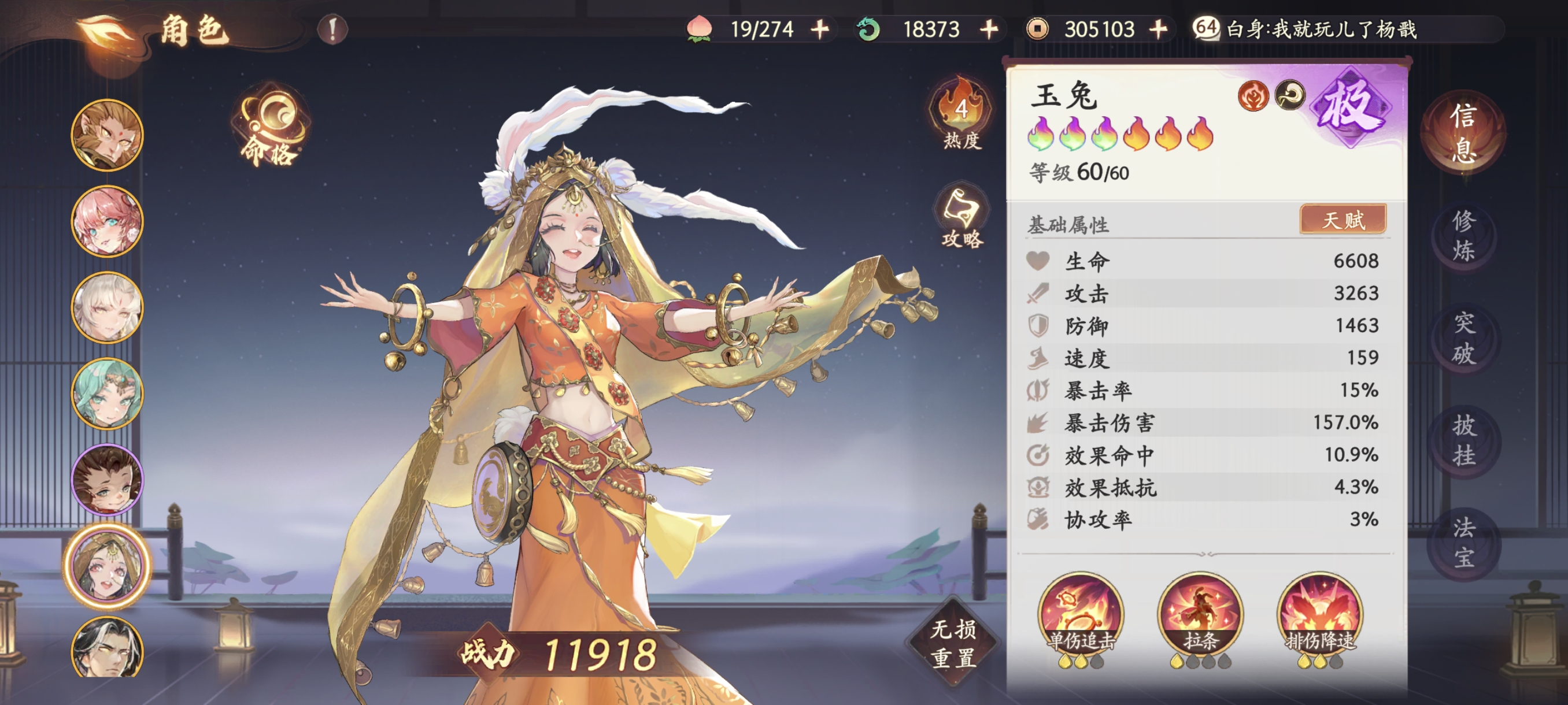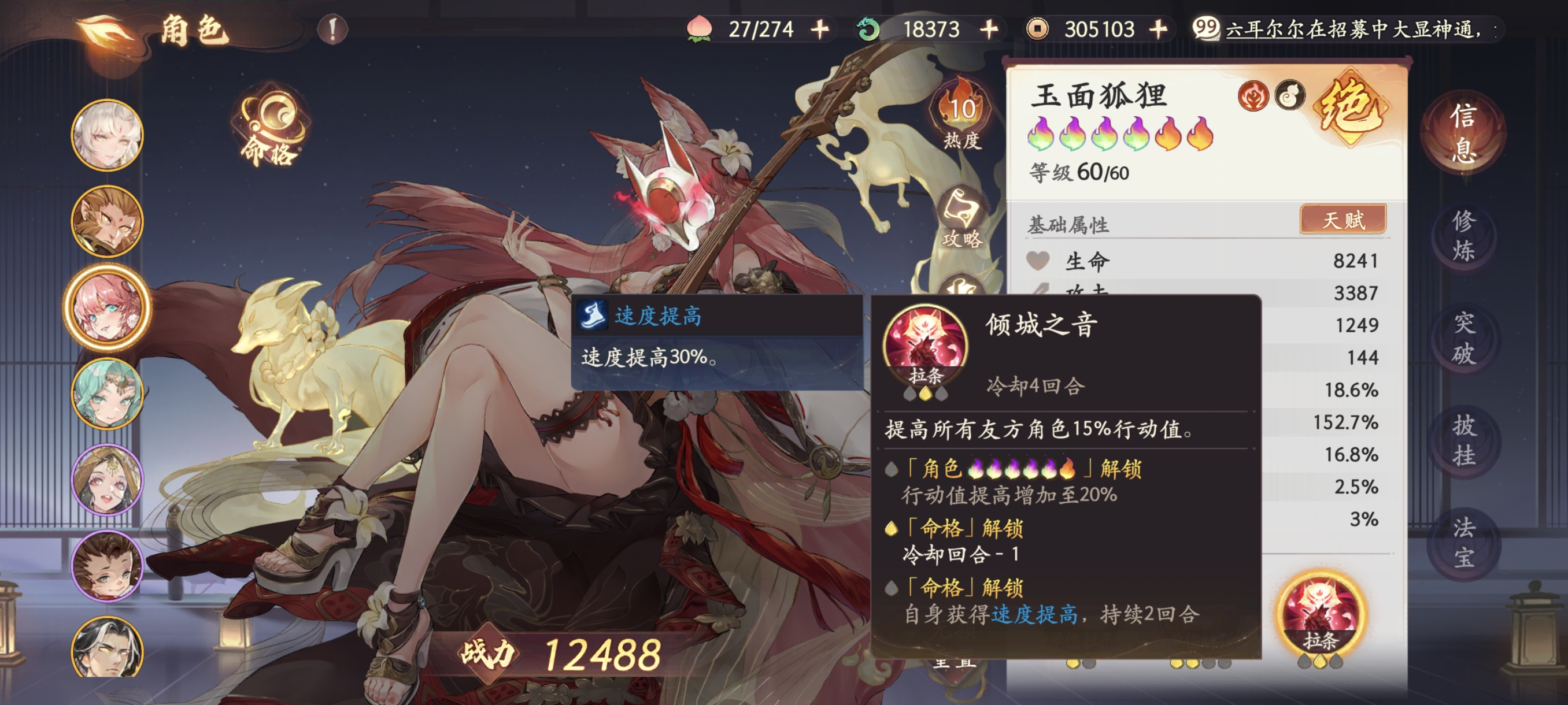 2、因为玉面狐狸的3技能能够全体拉条15%,所以玉面狐狸的速度需要比全队速度最快的嫦娥快15%以上,才能使本次拉条不会形成浪费。