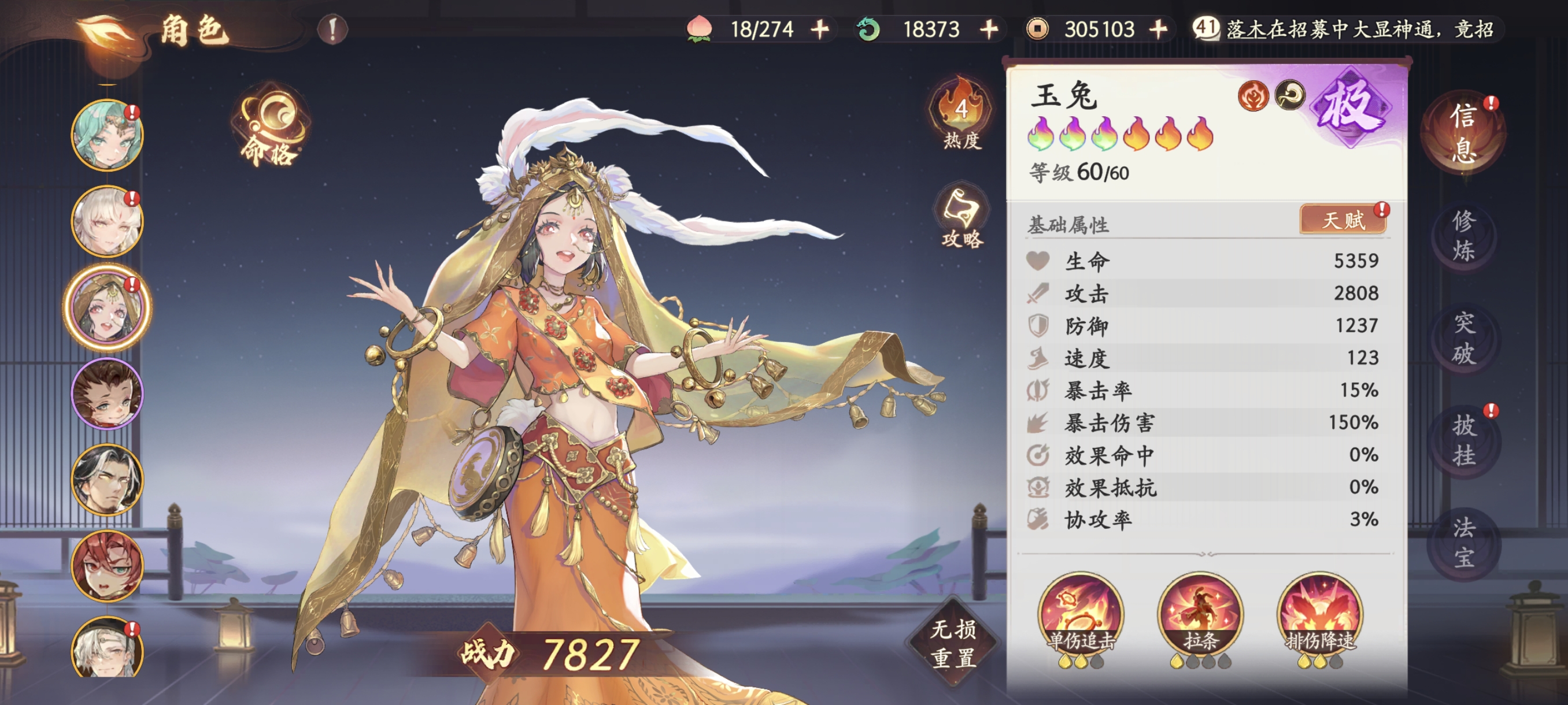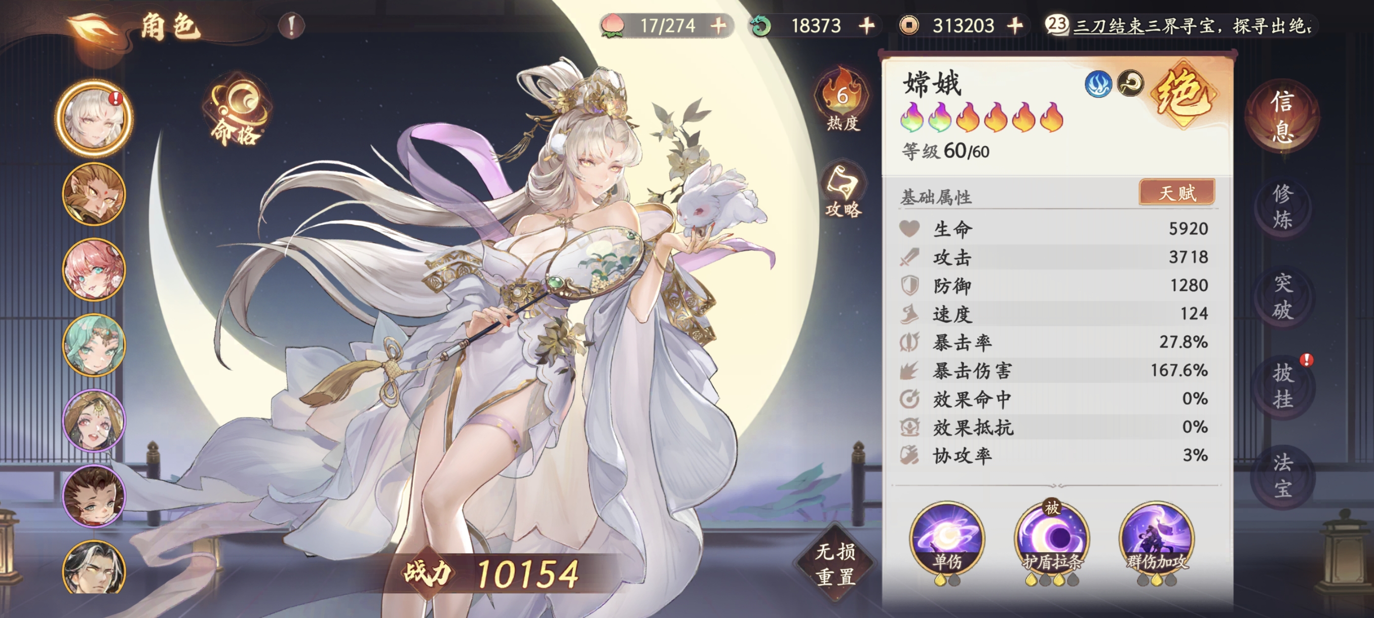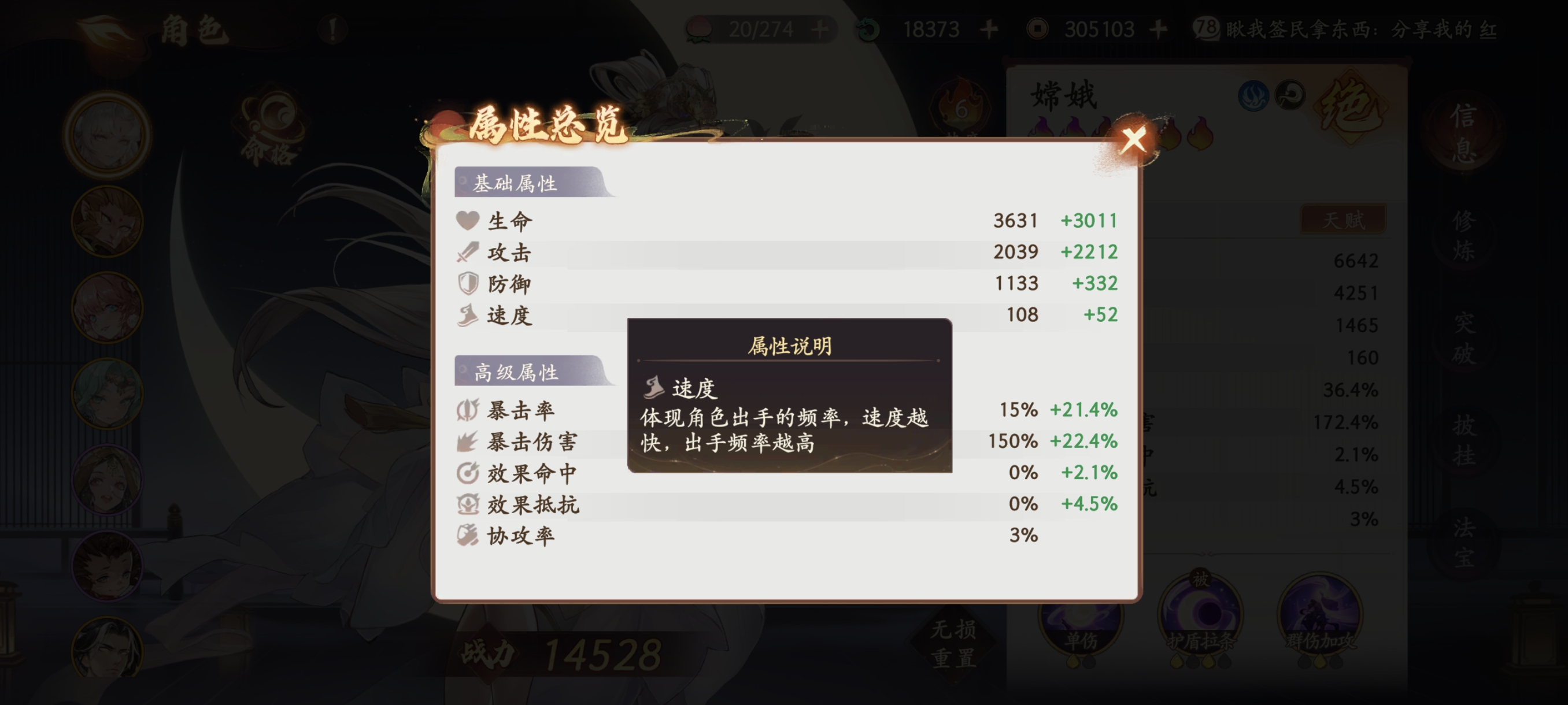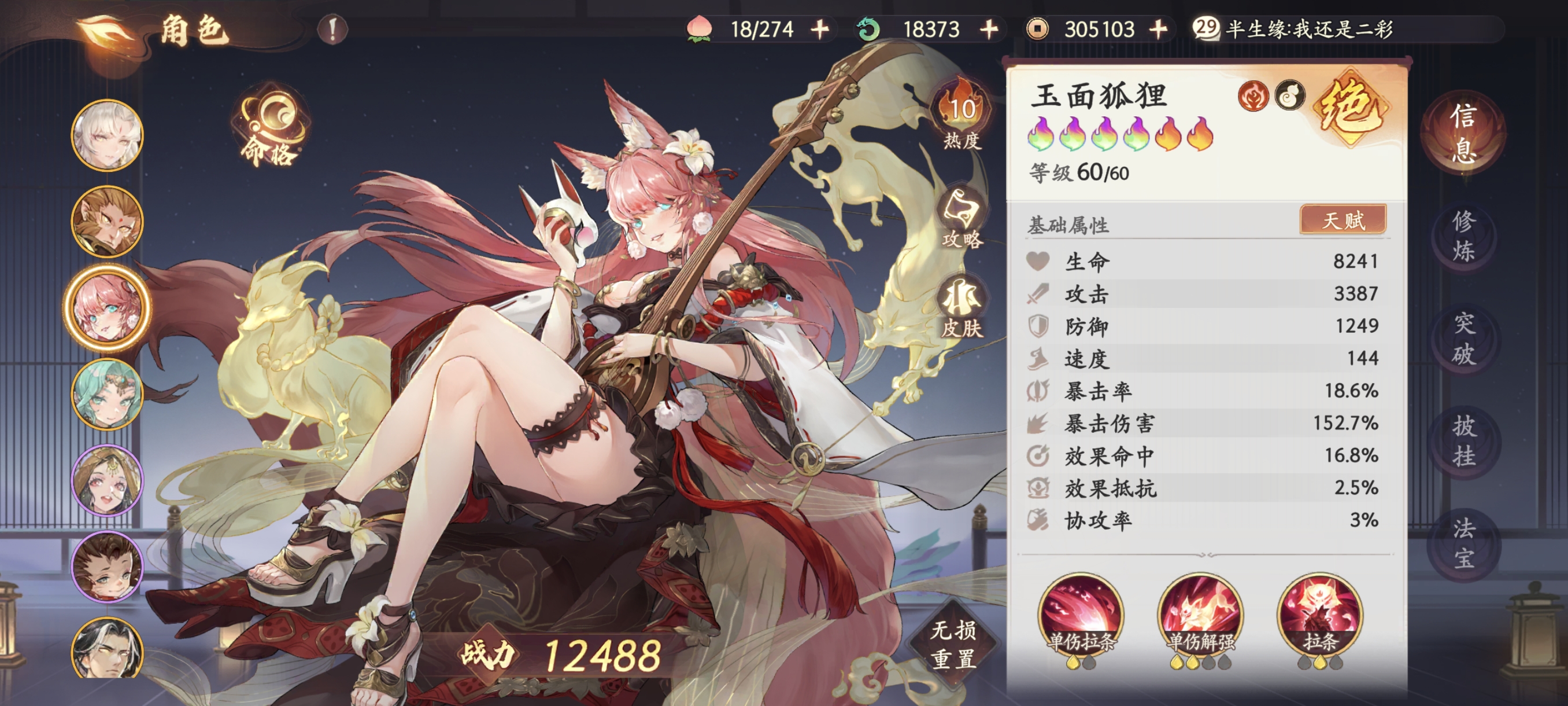 2、因为玉面狐狸的3技能能够全体拉条15%,所以玉面狐狸的速度需要比全队速度最快的嫦娥快15%以上,才能使本次拉条不会形成浪费。