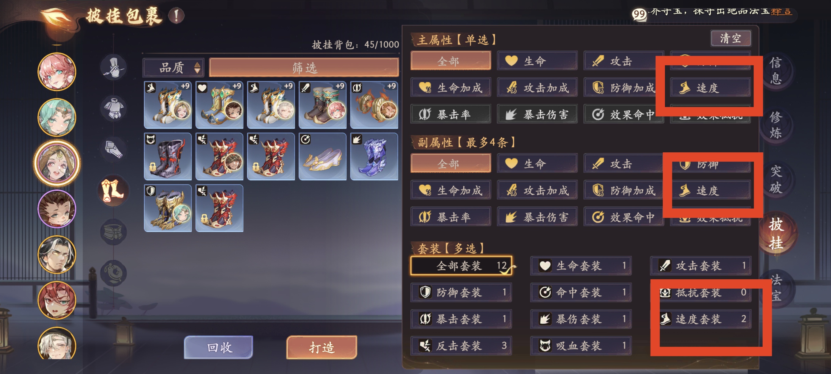 所有装备的副词条、鞋子部位的主词条和速度套的套装属性,都能提高速度属性。