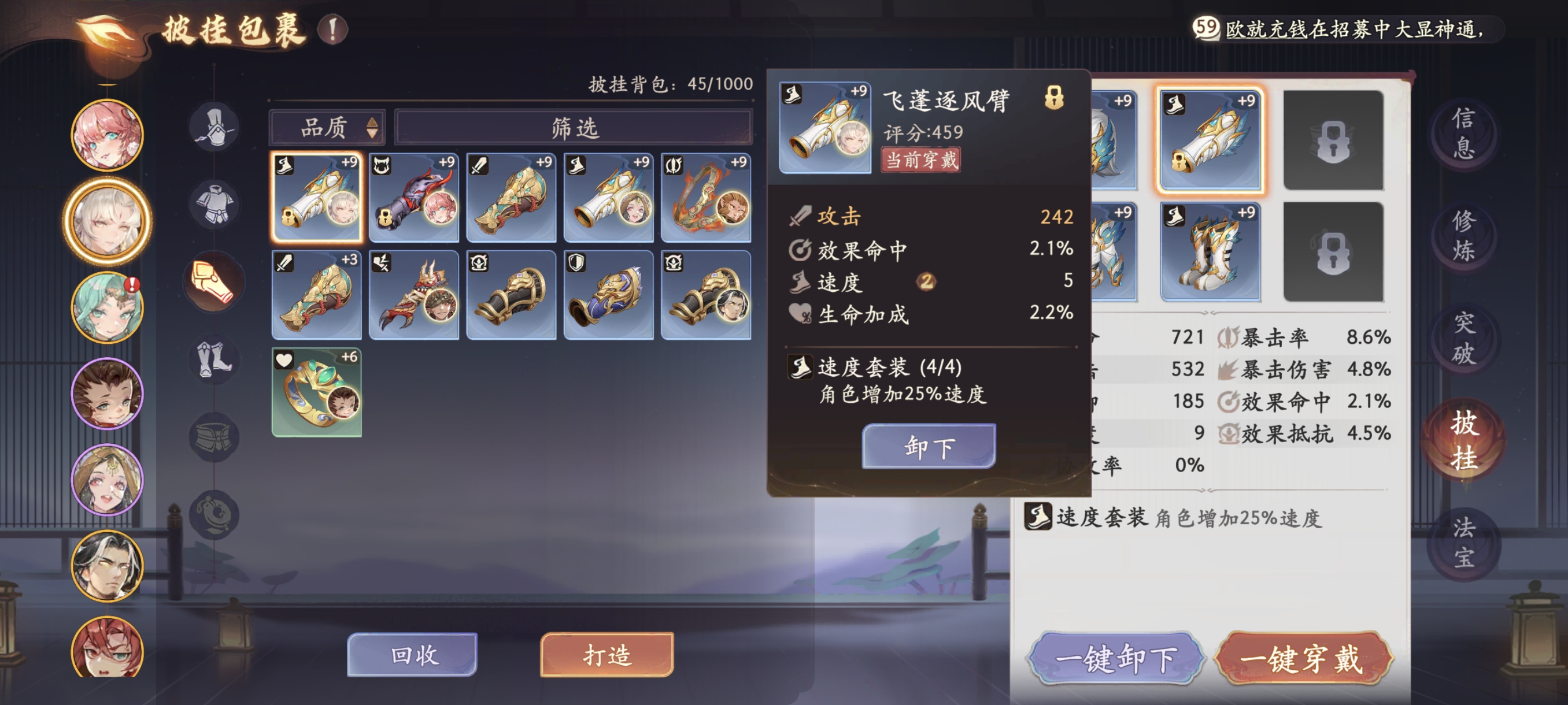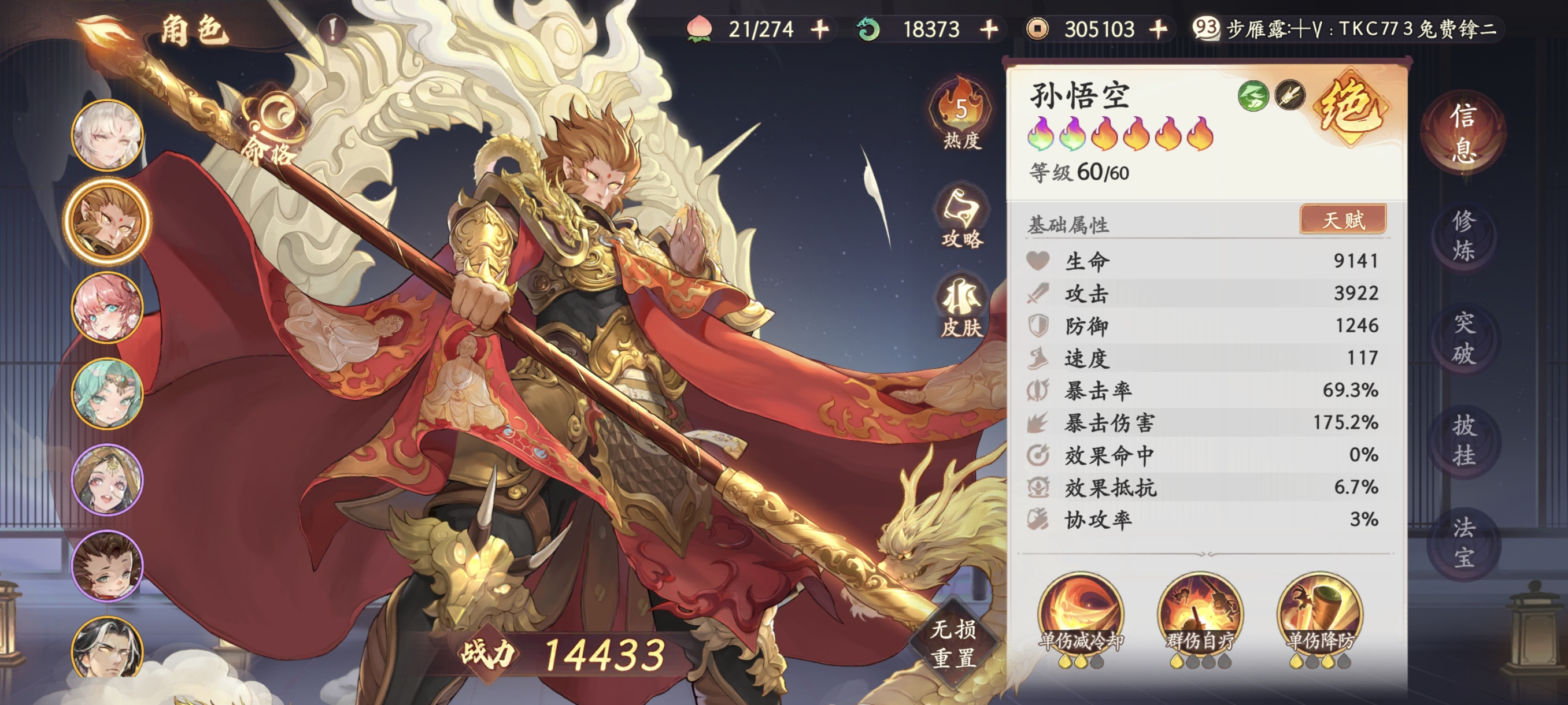 后者的输出明显是要远高于前者的,那么如何配速来达成这个目的呢?调整嫦娥的速度让她比孙悟空速度快(如图所示嫦娥速度124,孙悟空速度117),即可实现上述操作。