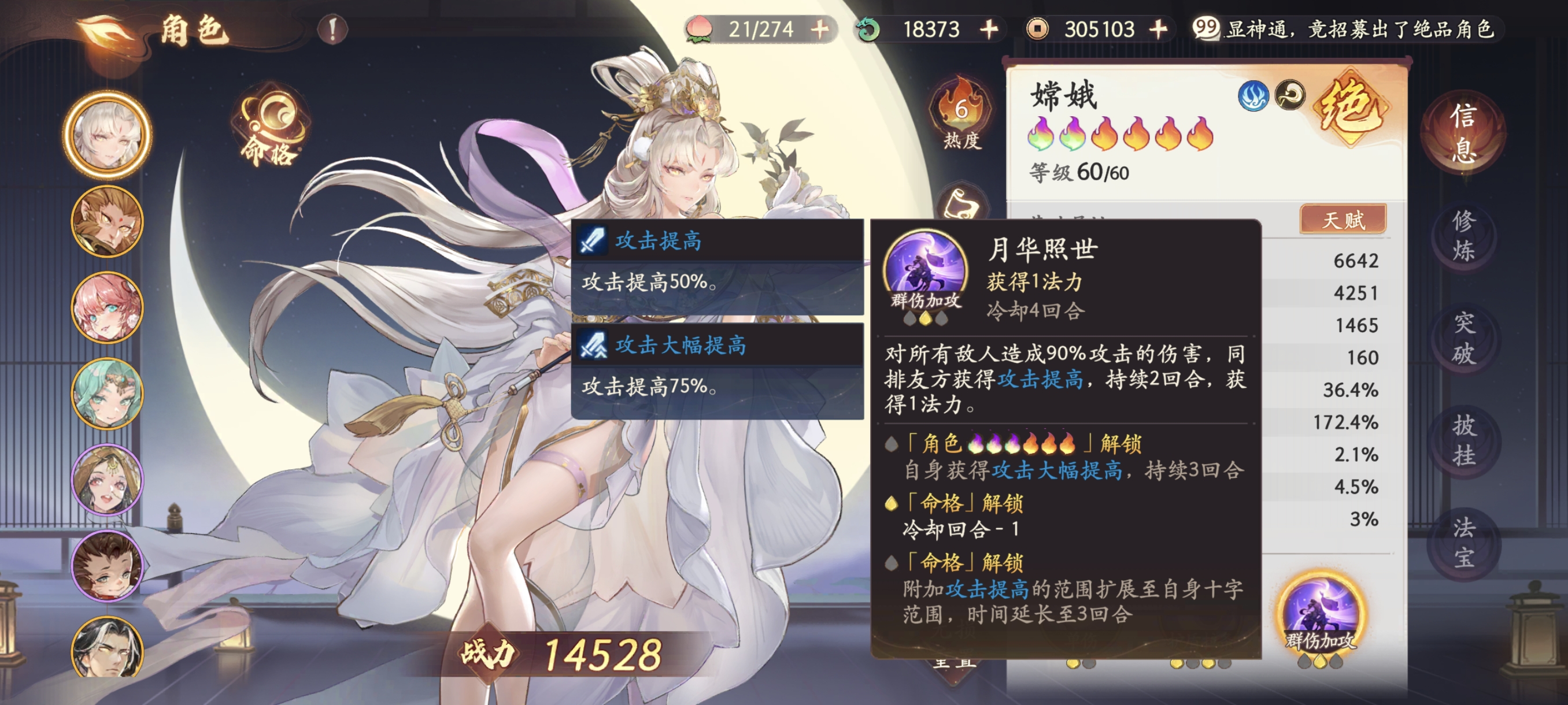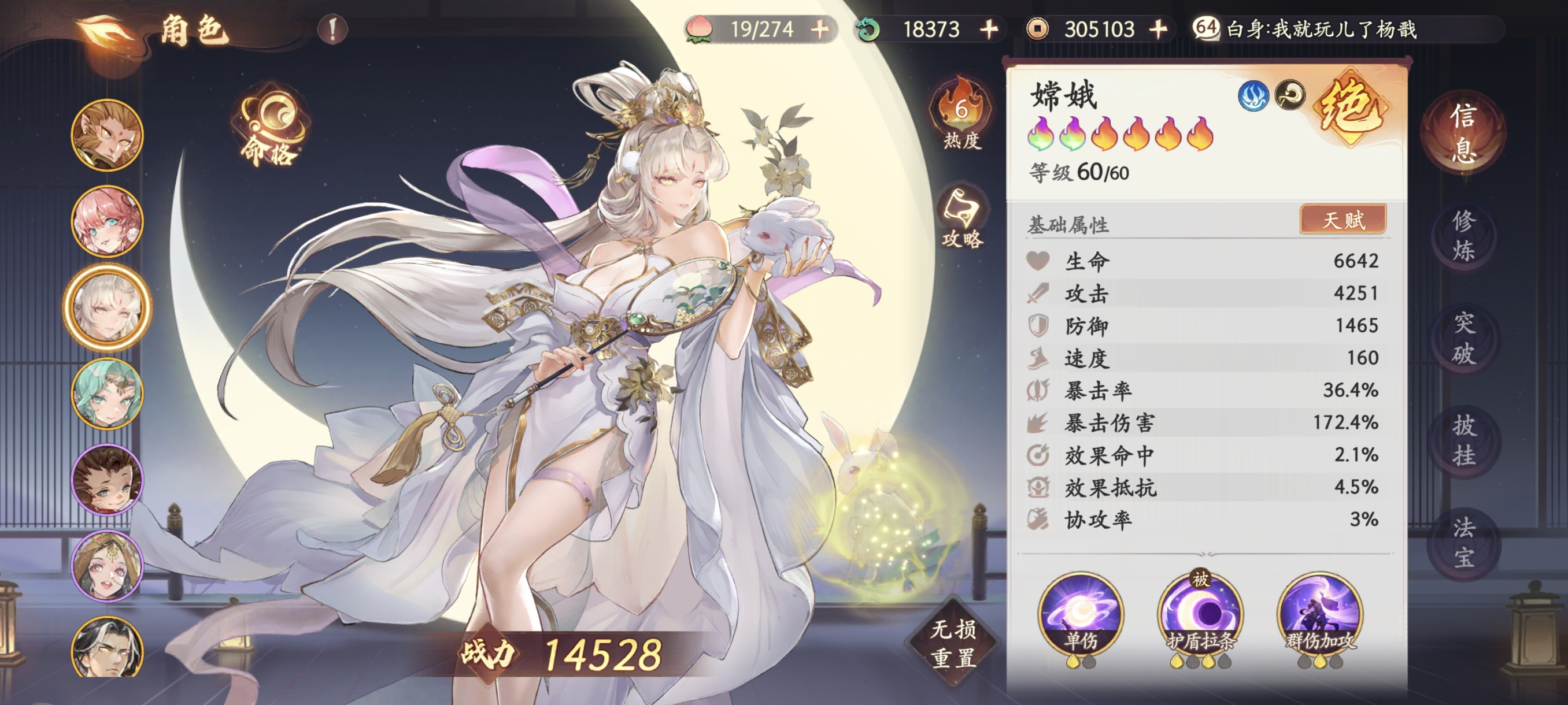 3、上面说过当玉兔的速度只比嫦娥慢1点时,嫦娥行动后,玉兔可以马上行动并施放2技能,对嫦娥进行100%拉条,使嫦娥再动。