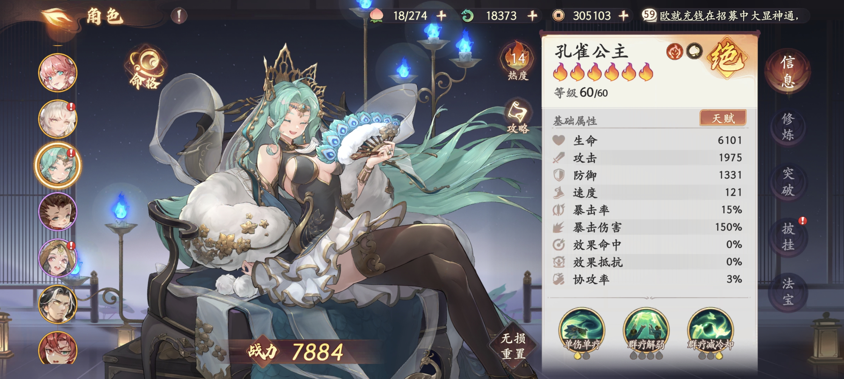 想要完美利用该效果,需要孔雀的速度比狐狸、嫦娥、玉兔都慢一些即可,所以我们给孔雀配速至121点。