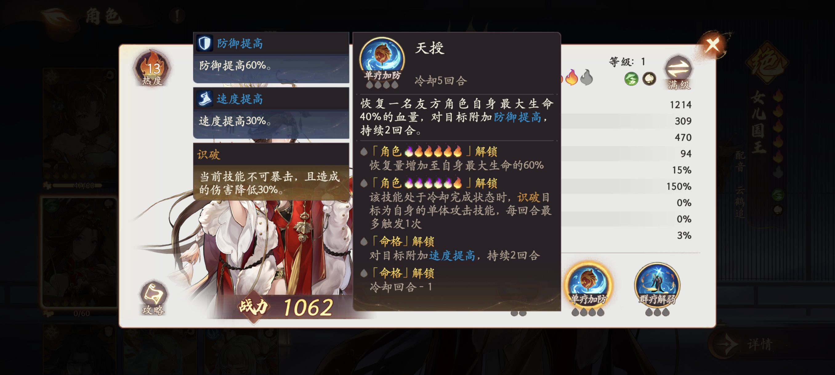 女儿国王的2技能,除治疗外还能为目标附加30%速度提高,持续2回合。*因为技能附加的配速通常不能在刚进战斗生效,所以不在配速中讨论。