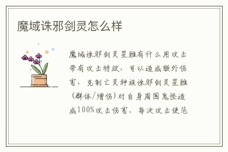 攻击带有攻击特效,魔域私服刷宝宝可以造成额外伤害,克制亡灵种族诛邪剑灵星雅 (群体/增伤)对自身周围鬼怪造成100%攻击伤害。每次攻击使范围内鬼怪虚弱,使其受到伤害增加10%/15%/30%,持续3/3/6秒。