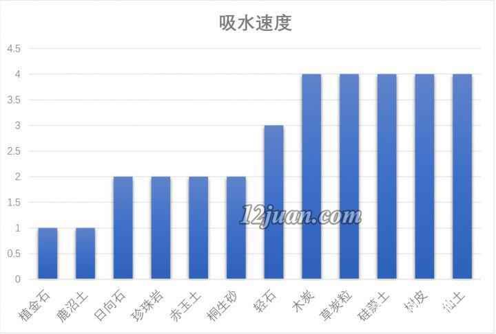 关于吸水速度的结论是:鹿沼土和植金石最快,日向石、珍珠岩、赤玉土、桐生砂次之,轻石稍慢,木炭、草炭粒、硅藻土、树皮、仙土是最慢的,一晚也没有完全浸透。