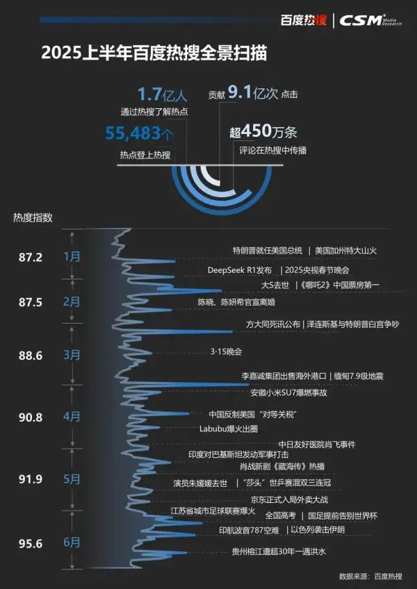 7月28日,魔域boss版怎么玩百度热搜联合中国广视索福瑞媒介研究(CSM)正式发布《2025上半年百度热搜报告》。这份基于5.5万个热点议题和逾1.7亿用户行为数据的报告,清晰呈现了国民关注焦点的变迁轨迹。