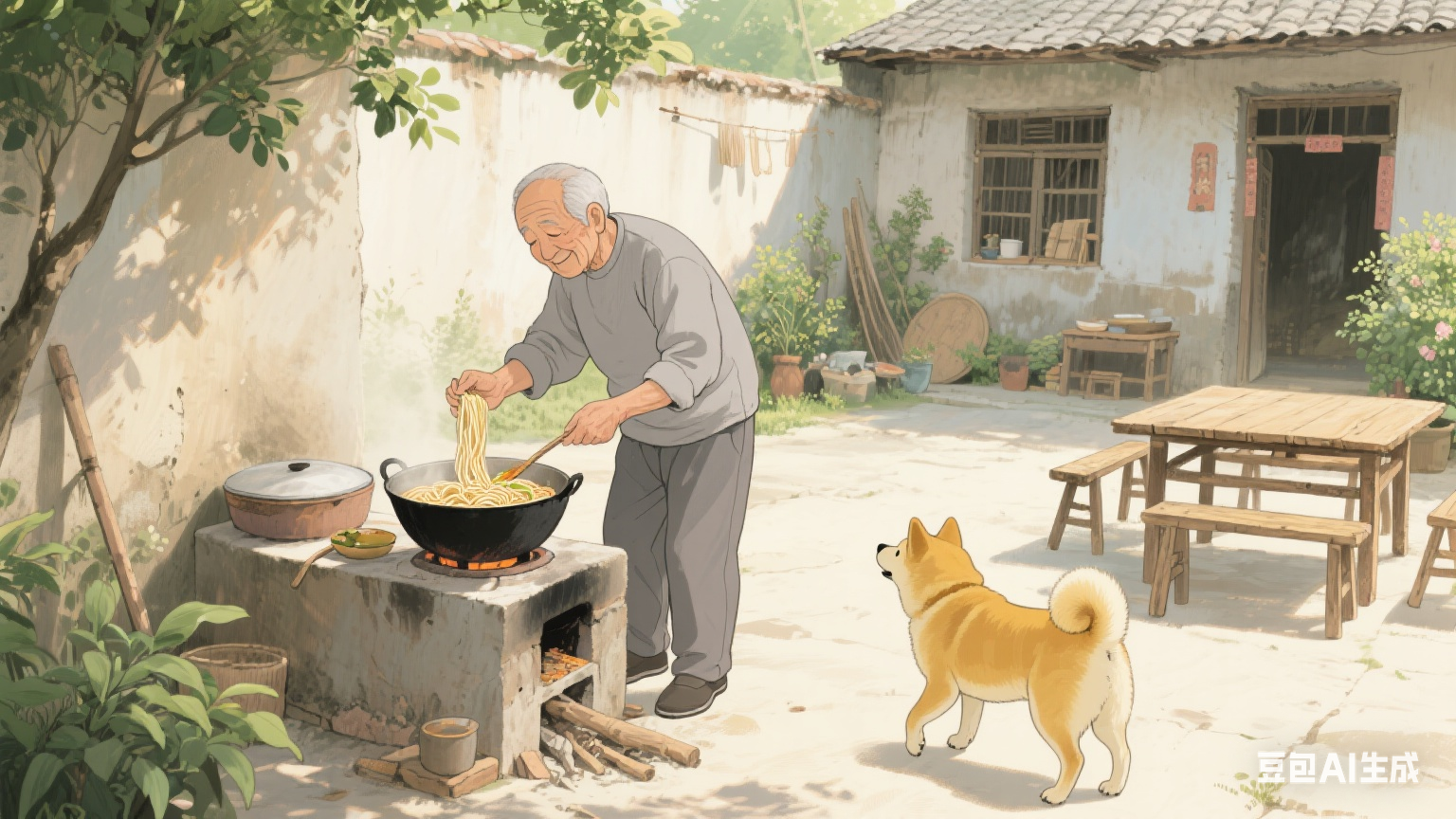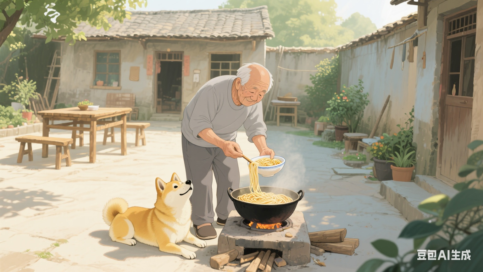 分镜一:农村院子里,灶台上的锅冒着热气,70 岁和蔼的老爷爷身穿灰色上衣和裤子,正从锅里盛面条到自己碗里,旁边卧着一只黄色柴犬,仰头看着老人。