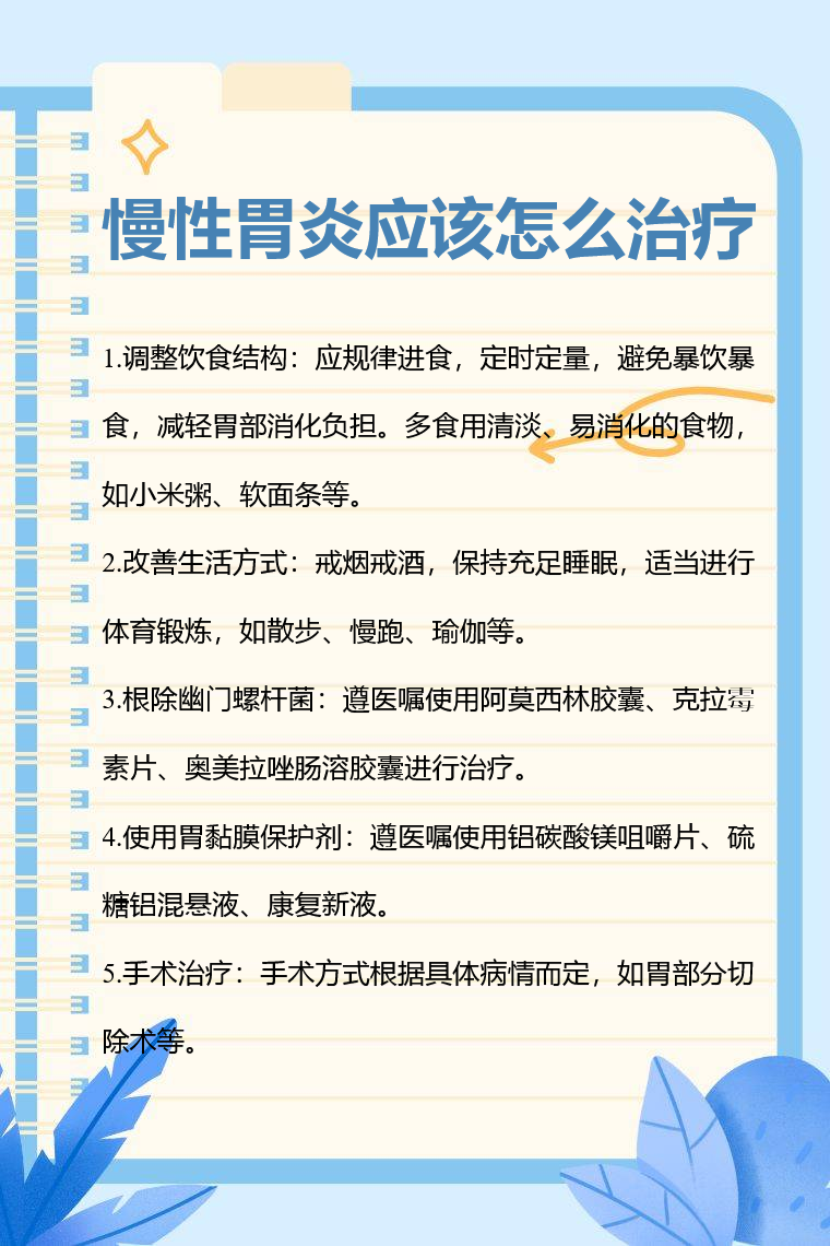 慢性胃炎的治疗方法主要有调整饮食结构、改善生活方式、根除幽门螺杆菌、使用胃黏膜保护剂、手术治疗等。