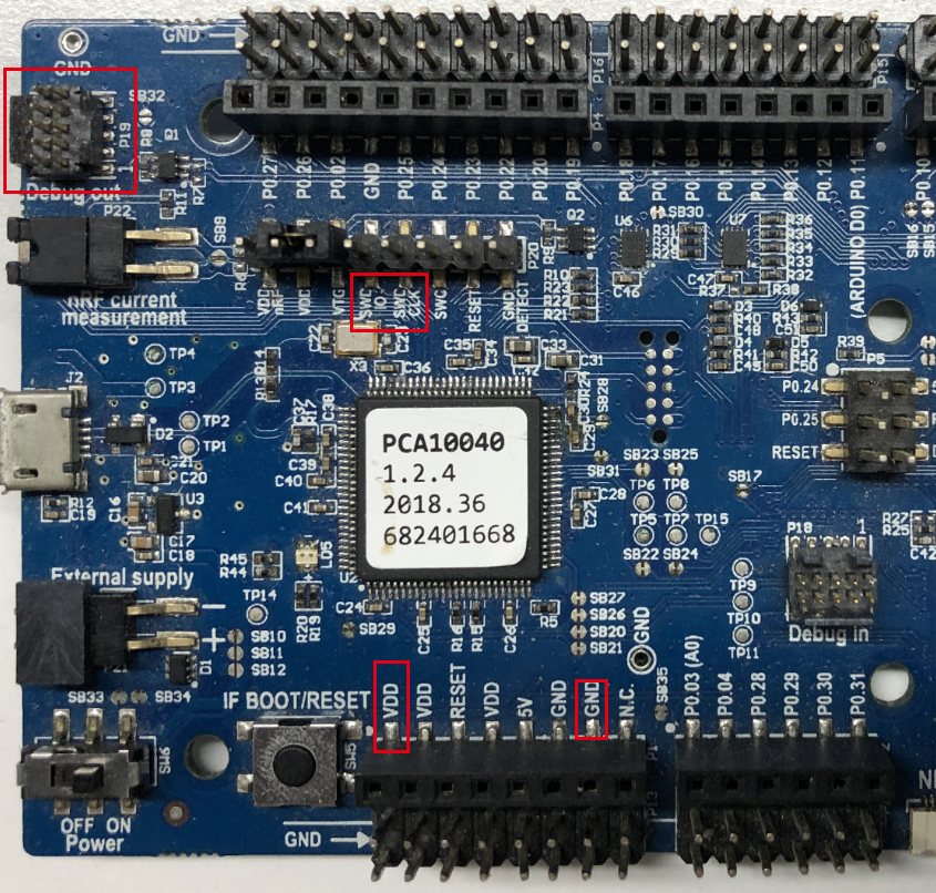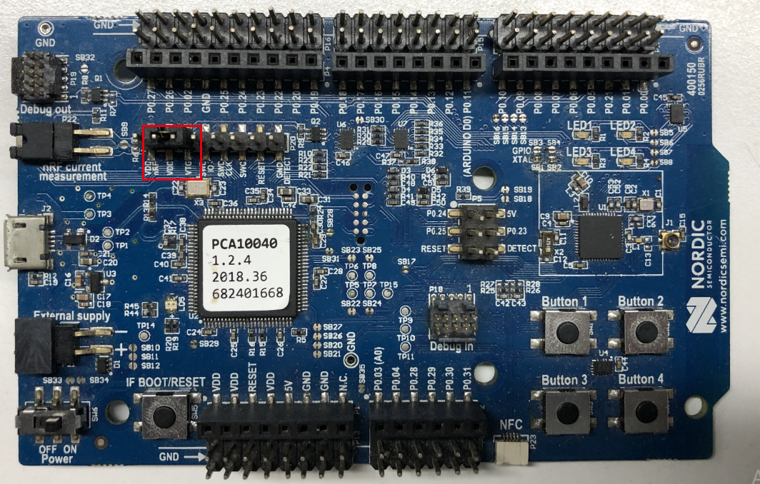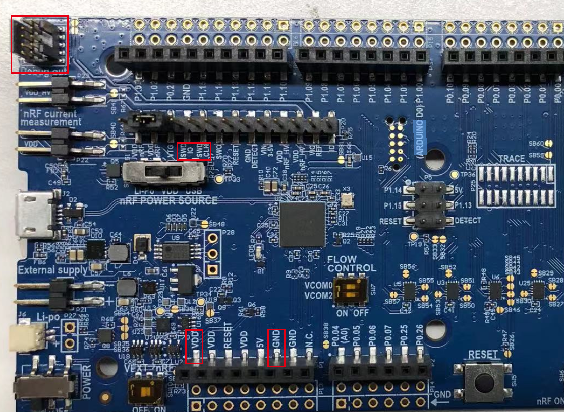 DK上的Jlink默认连接的是DK上的芯片,如果要做Jlink外接烧录自己的板子,需要在DK的VDC/VDD和VTG插针上插一个跳帽即可。