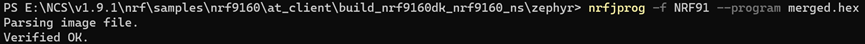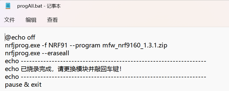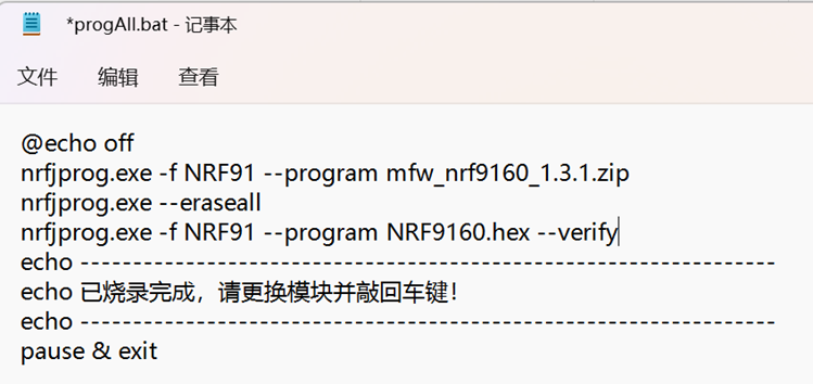 以上截图中的文本实现了烧录nRF9160的Modem固件,然后擦除nRF9160的Flash,最后烧录nRF9160的application固件。