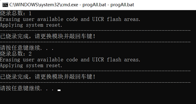 保存后,将DK的SWD接口与需要烧录的板子接线连接,打开批量烧录.bat,将可以看到命令已经执行,重复敲击键盘上的任意按键,批处理文件可以记录已烧录的数量。