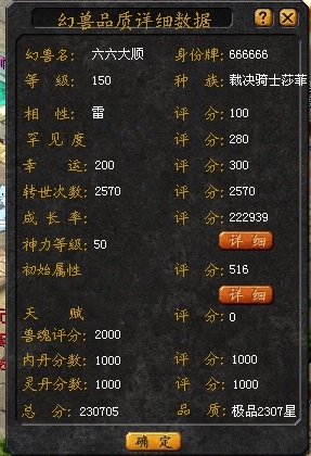 关于这只莎菲我想也有着不少的故事,能把一只法师系的宝宝能够合到2300多星其实真的不是很多,就目前主流情况下,战士宝宝或者说,双修宝宝成为主修宝宝的时候,能有这么一只高星法宝宝真的很让人欣慰