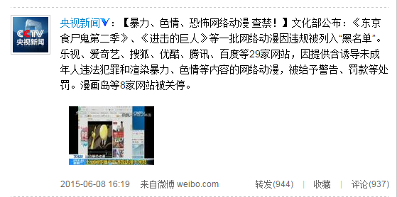 据“央视新闻”官方微博消息:“文化部公布:《东京食尸鬼第二季》、《进击的巨人》等一批网络动漫因违规被列入“黑名单”。乐视、爱奇艺、搜狐、优酷、腾讯、百度等29家网站,久久魔域130区因提供含诱导未成年人违法犯罪和渲染暴力、色情等内容的网络动漫,被给予警告、罚款等处罚。漫画岛等8家网站被关停。”