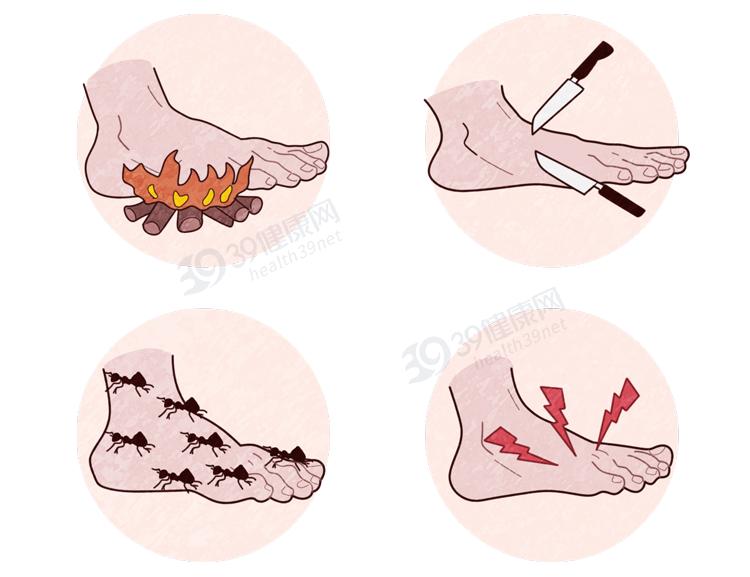 糖尿病周围神经病变可累及神经系统的各个部分,主要表现为烧灼感、针刺感及电击感,夜间重,有时疼痛剧烈难以忍受而影响睡眠,还可出现肢体麻木感、蚁走感等活动后可好转。