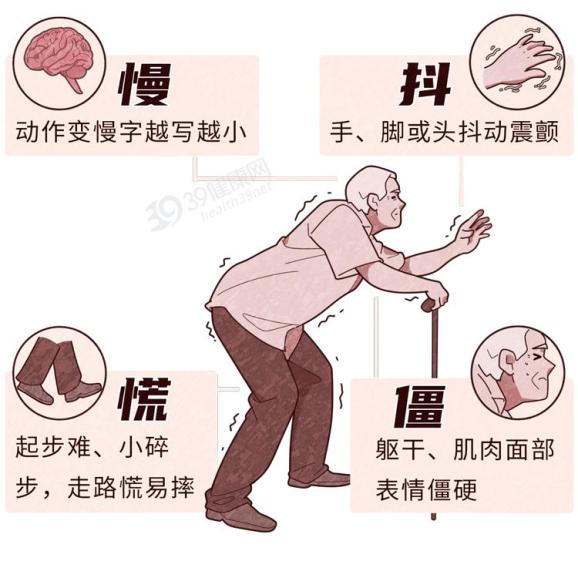 又称原发性震颤性麻痹,症状表现为震颤、肌强直、姿势及步态不稳。多发生于50~80岁,80%的患者会先从一侧手臂的手指开始震颤,逐渐扩展到四肢和全身。