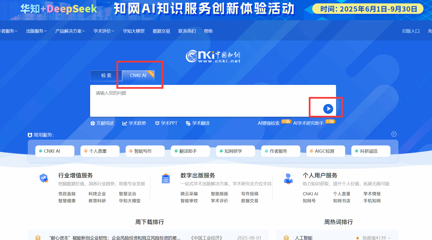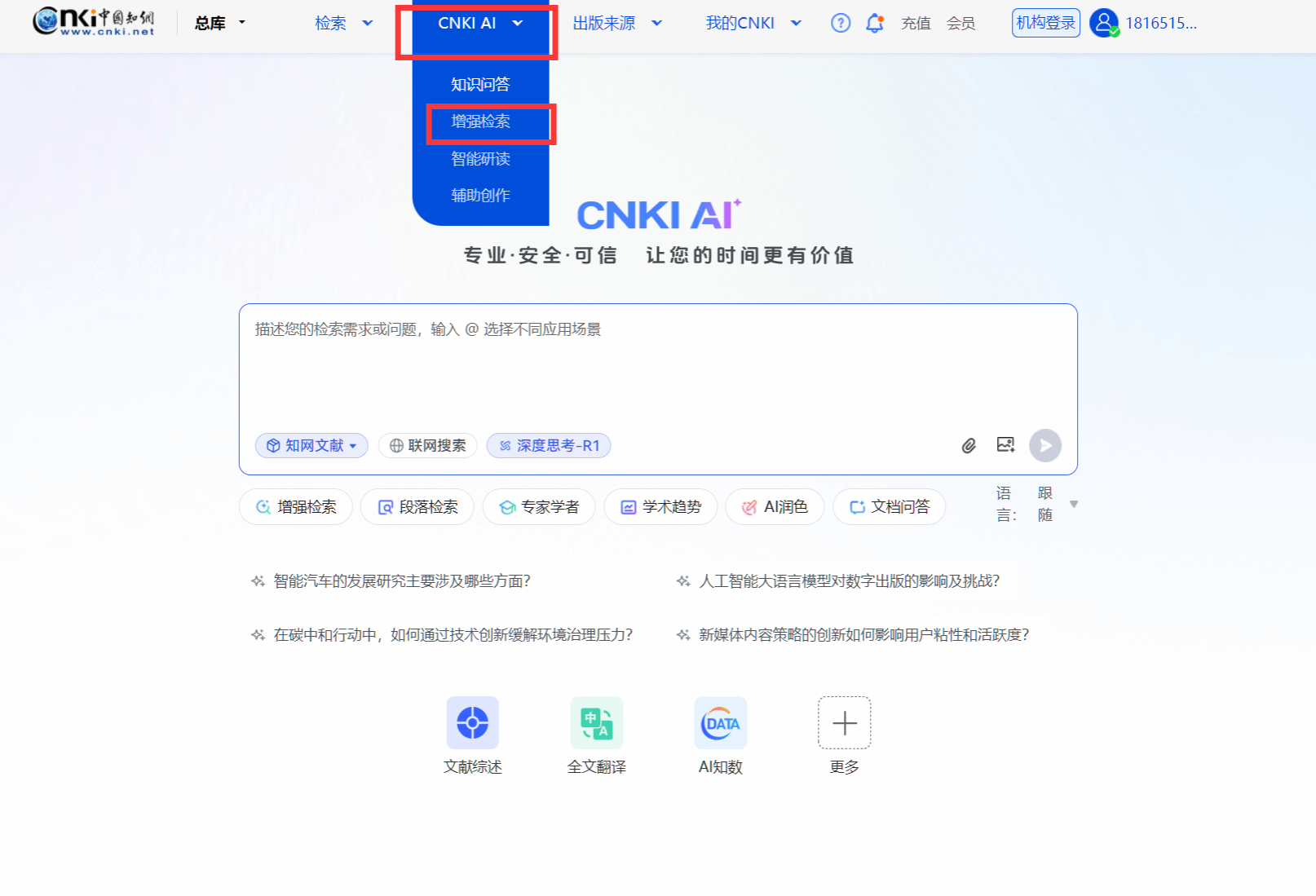 步骤1:登录知网首页,切换至CNKI AI ,点击问答按钮,或直接输入https://ai.cnki.net/chat?question=&type=fulllib进入