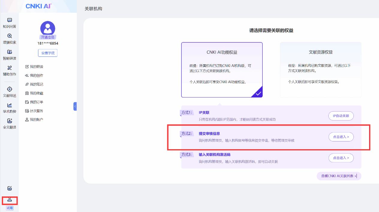 方式一:点击个人界面,选择方式二输入机构账号xa0076AI以及个人信息提交即可关联成功。一般为自动审核,提交后等待30秒即可。