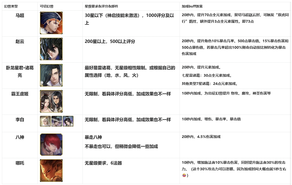 举个例子,马超赵云是切宝宝玩法的主流选择,提前出征马超赵云,使用这两只幻兽的技能,触发马超的被动技能“狮心骁魂”与赵云的神启技能“勇决神义”,实现额外的buff加成。召回幻兽后,再出征自己的主力幻兽进行攻击输出。