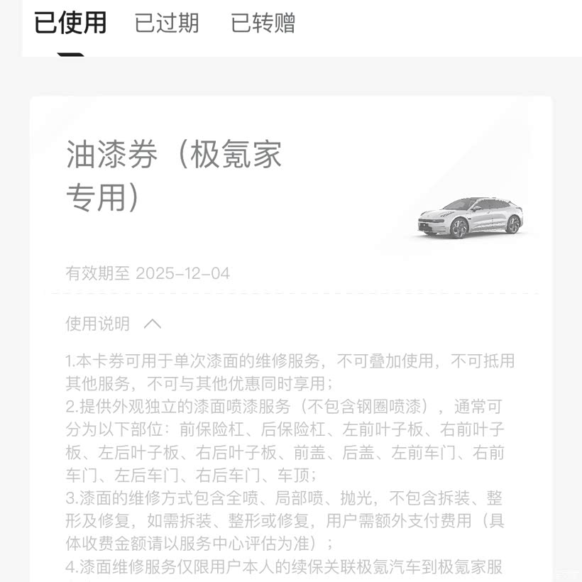 大家是不是以为我掏了1200大洋去补一个门的漆,那就错啦。在我车子续保的时候,选择的是极氪官方的保险,送了我两张油漆券,这次修直接用了一张。