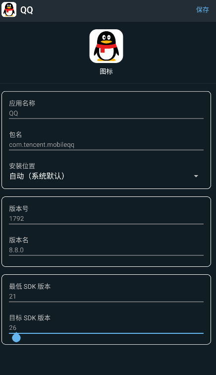 3、你可以修改APK的图标、应用名称、包名等信息,修改完后点击保存即可。