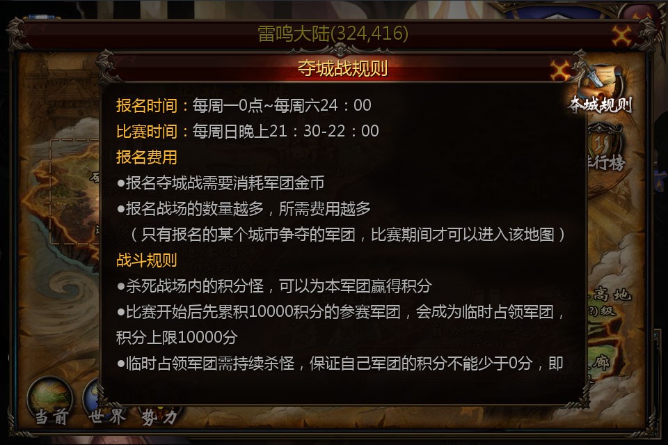 军团战的本质即为争夺——争夺城市。因此它也被称为夺城战。夺城战的基本规则可以在军团领地界面查看。(菜单—军团—内政管理—军团领地—夺城规则)