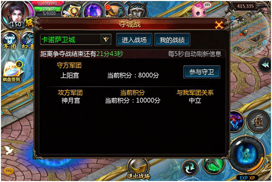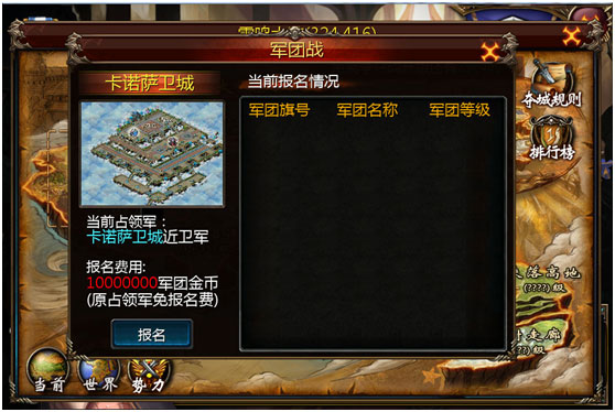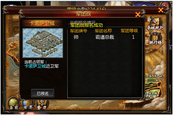 此时就算报名成功了。军团成员们只需等到争夺战开始时进入战场地图,按照军团战规则进行城市争夺即可。