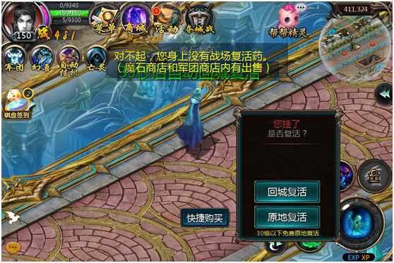 在军团地图内死亡,画面上将出现使用战场复活药的“快捷购买”提示。