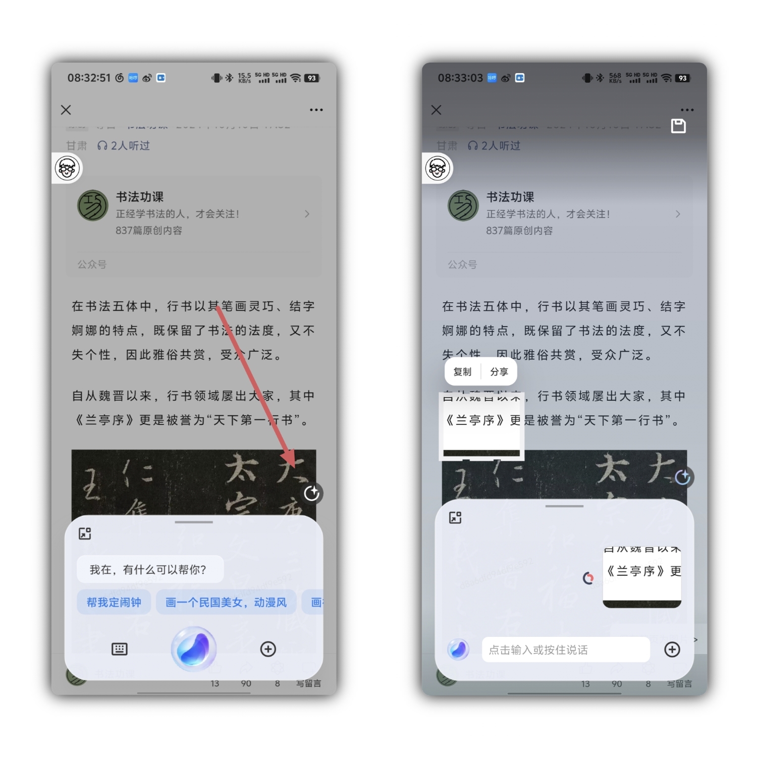 OriginOS 5的智能识别功能也非常强大。用户可以通过智能识别,快速获取书法作品的相关信息。在“书法功课”公众号中,用户可以拍摄书法作品,系统会自动识别并提供详细的介绍和背景知识,这对于书法爱好者来说是一个极大的便利。