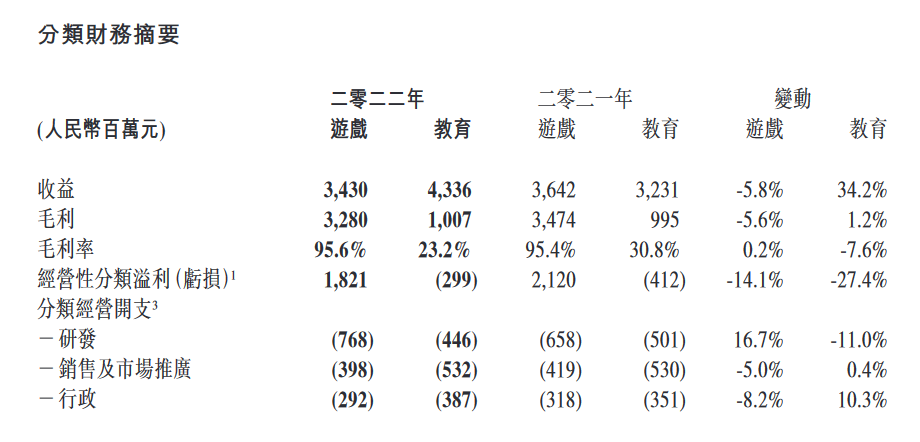 教育业务方面实现为43亿元,占集团总收入的55.1%,同比实现增长34.2%。而游戏业务收入为34亿元,同比下降5.8%。经营性分类溢利为18亿,同比减少14.1%。