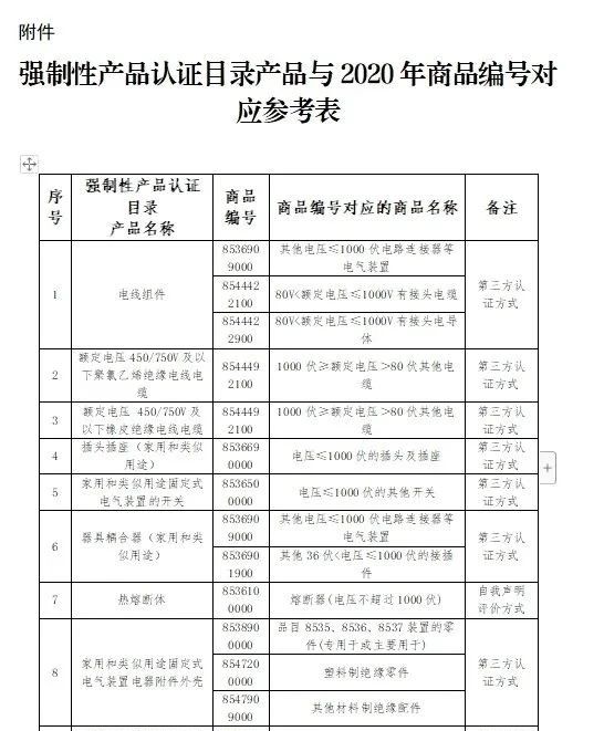 2020年市场监管总局、海关总署发布了《强制性产品认证目录产品与2020年商品编号对应参考表》(以下简称《参考表》)。