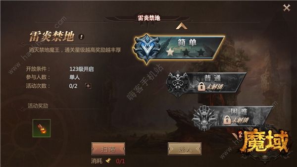 就目前来说,雷炎禁地算是中后期的副本之一,需要角色等级达到123级才能解锁并开启简单模式的副本。随着角色等级的不断提高,普通、困难、地狱、噩梦、传奇等难度也将随之开放。但前提是三星通关前一难度的副本方可。