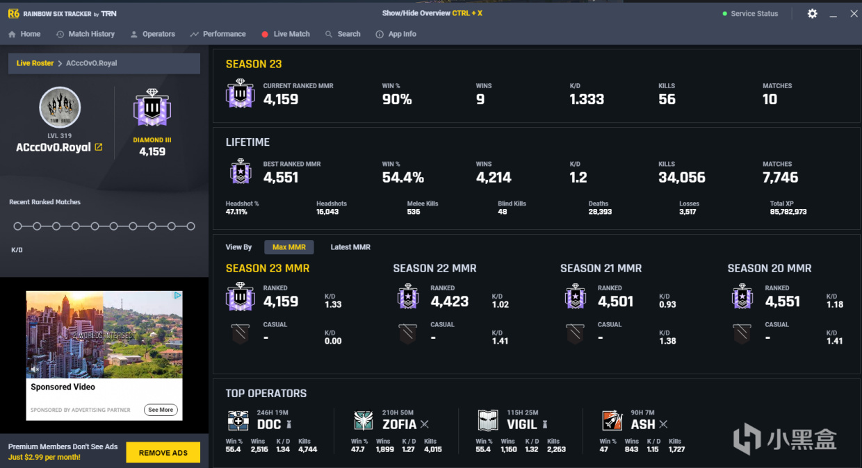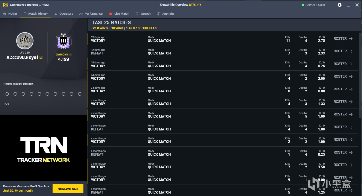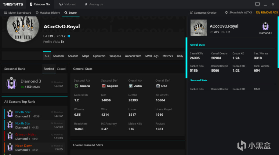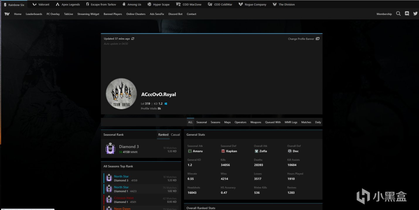 首先最简单的,我们可以用小黑盒查询战绩,很方便,但是有一点小问题就是很多号是查不到的,只能查到已经被黑盒账号绑定的那些ID,那么我们有两个更方便并且很多职业哥也在用的工具:R6Tracker 和 R6Tab ,而且这两个软件还会标注可能的作弊者