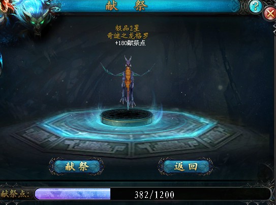 献祭就是放入其他的宝宝也增加献祭点,如图的奇迹龙,不到280分的加180点的献祭点,3星的310点,星级越高,得到底献祭点越多。献祭亡灵宝宝可以多加10点。可以用献祭点召唤亡灵宝宝。