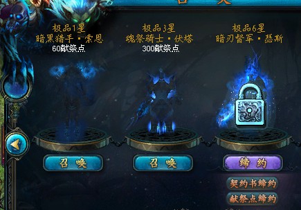 打开亡灵结界出来的页面有3个信息点,献祭,召唤,和献祭商店。