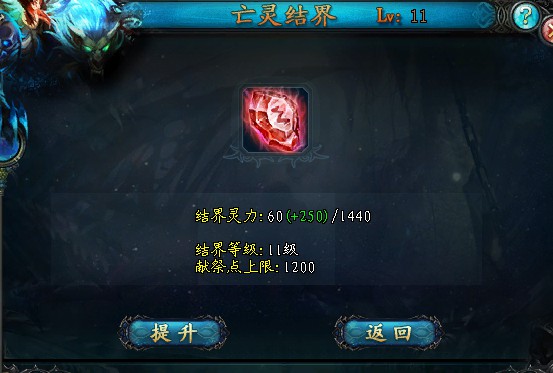 提升亡灵结界的等级可以在魔石买结界水晶,一阶结界水晶2魔石,加20点的结界经验,8阶的结界水晶400魔石,加4000点的结界经验,算起来一点也没便宜。