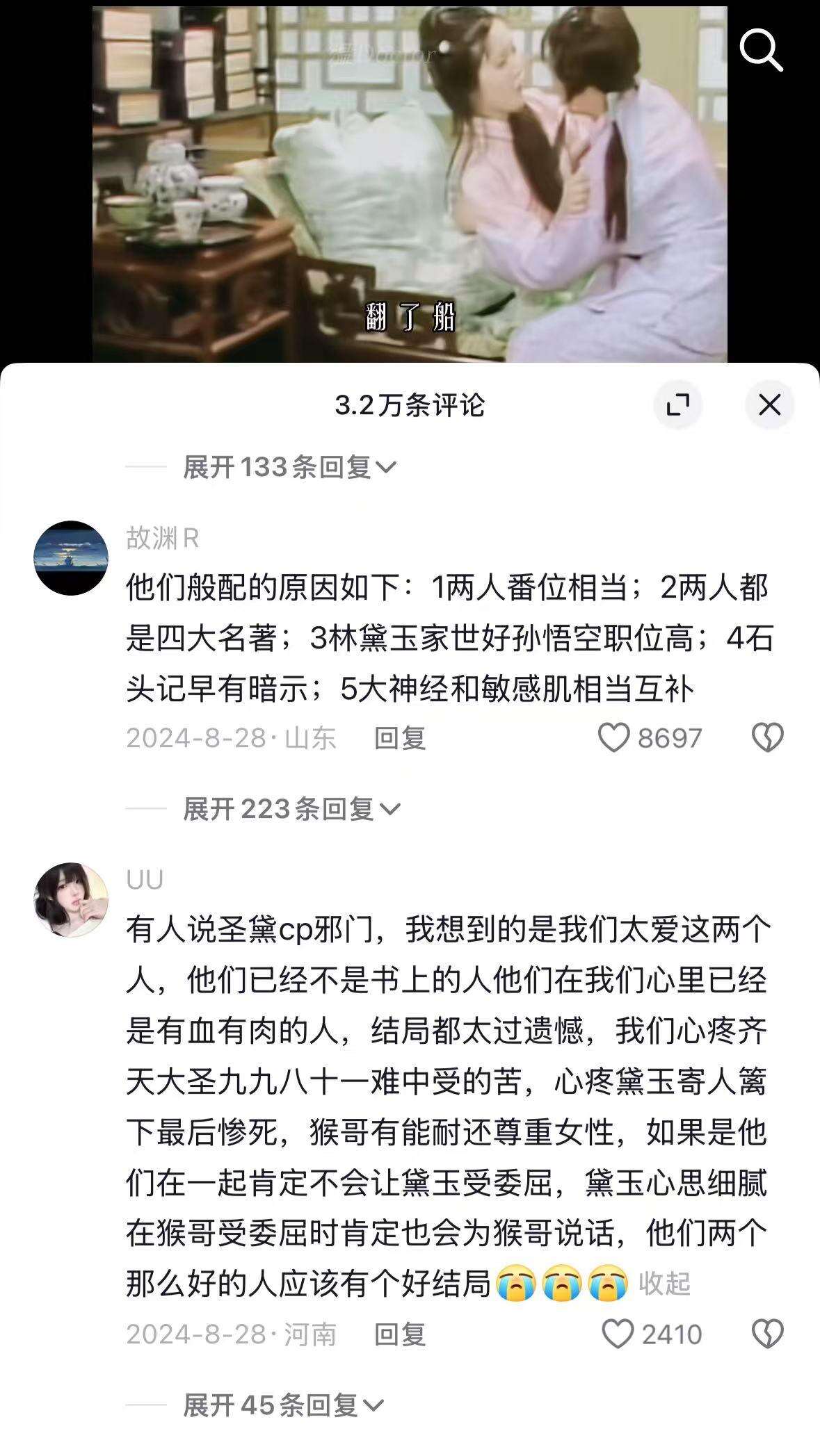 评论区还有“老实人”在认真罗列着“圣黛”的合理之处。网友“淼淼”就留言列举二者般配的原因:“两人番位相当,都是四大名著男女主;作品元素也对应。孙悟空从石头缝里蹦出来,正对上《红楼梦》的原名《石头记》;他们刚柔相济,性格相配,粗神经和‘敏感肌’性格互补”。