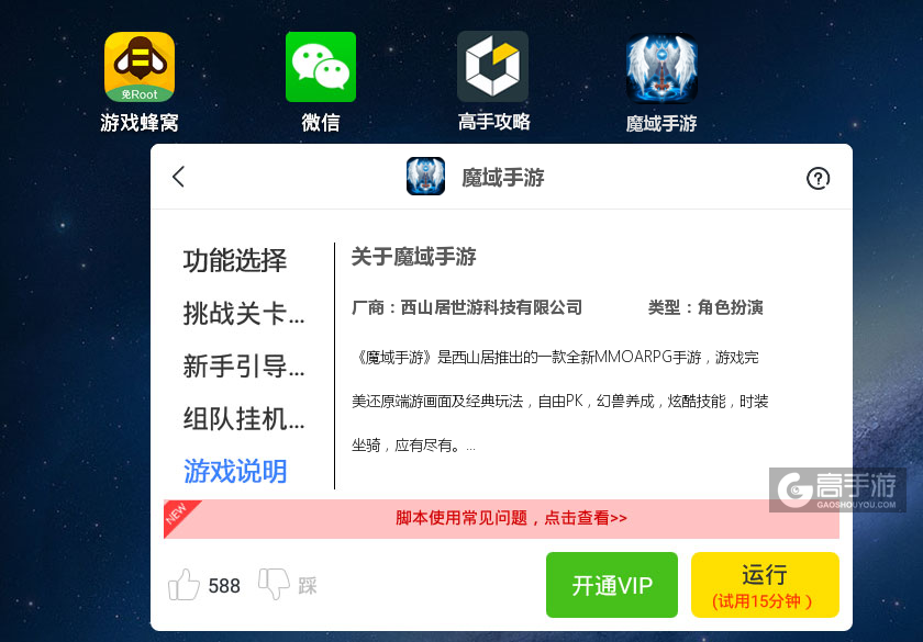 提示:本次下载的魔域手游辅助工具软件是高手游联合市场排名第一“蜂窝游戏”推出的魔域手游定制版辅助软件工具,特意针对魔域手游进行了性能优化、兼容性优化等。