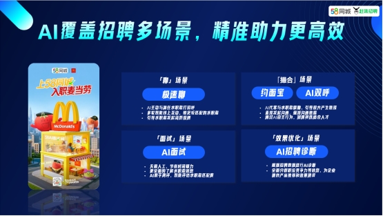 面对招聘行业痛点,58同城打造覆盖招聘全场景的AI产品矩阵。其中,“极速聊”利用AI主动触达潜在求职者,引导适配人才进行简历投递;在提高招就双方匹配效率上,58同城推出“约面宝”“AI双呼”,让AI承担基础、重复的沟通工作,快速筛选合适人才;在“面试”场景,58同城创新推出的“AI面试”将数字人面试与智能测评系统相结合,可自动向求职者发起面试邀请,并依据沟通情况生成AI面试报告,极大地节省了时间和人力成本,提高了招聘效率。