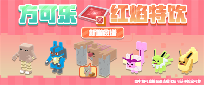 2024年4月11日-5月2日,活动特别料理“方可乐红焰特饮”正式开启,探险家们可以参与活动可以获得食材红焰果。“方可乐红焰特饮”可以吸引小拉达、地鼠、猴怪、瓦斯弹、小拳石、百变怪、大岩蛇、腕力、波波、化石盔、飞腿郎、路卡利欧,以及全新异色宝可梦异色水伊布、异色雷伊布、异色火伊布,还有搬运小匠也来助你一臂之力!
