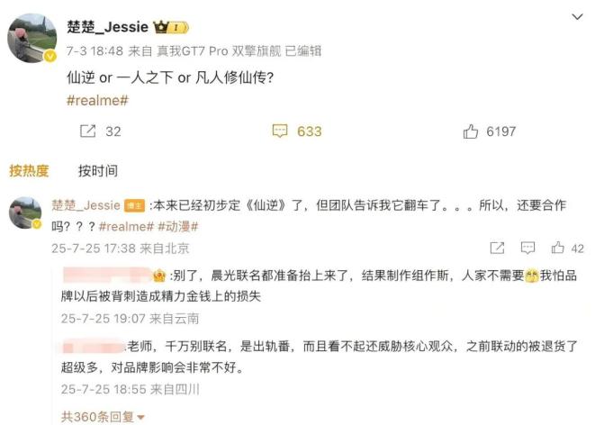 比如近期《仙逆》年番的负面舆论,也直接影响了国产动画在IP商业化领域的口碑。事件一出,粉丝纷纷去电商平台退货退款,出坑出物,去各大合作品牌社媒评论区抗议。此前早已官宣的晨光文具与《斩神》《剑来》《仙逆》3个动画IP的长期合作,负面事件后品牌方直接在最新宣传物料中删除《仙逆》动画相关素材避风头。同期,realme中国区CMO@楚楚_Jessie 发微博,直言《仙逆》的翻车影响了品牌合作意向。