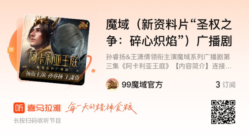 喜马拉雅用户可直接扫描图片中的二维码收听,还可进入小甜心公众号的菜单栏,点击“全新广播剧”快捷收听哦!