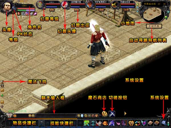 人物属性:显示玩家的装备信息以及体力、经验、物攻、魔攻等属性数值。