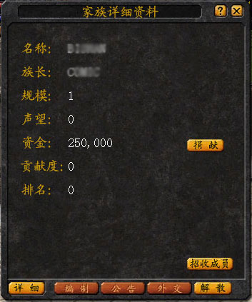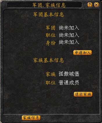 点击“军团”按钮,即可弹出家族控制面板。族长的一切权力都可通过这个面板上的功能按钮实现。
